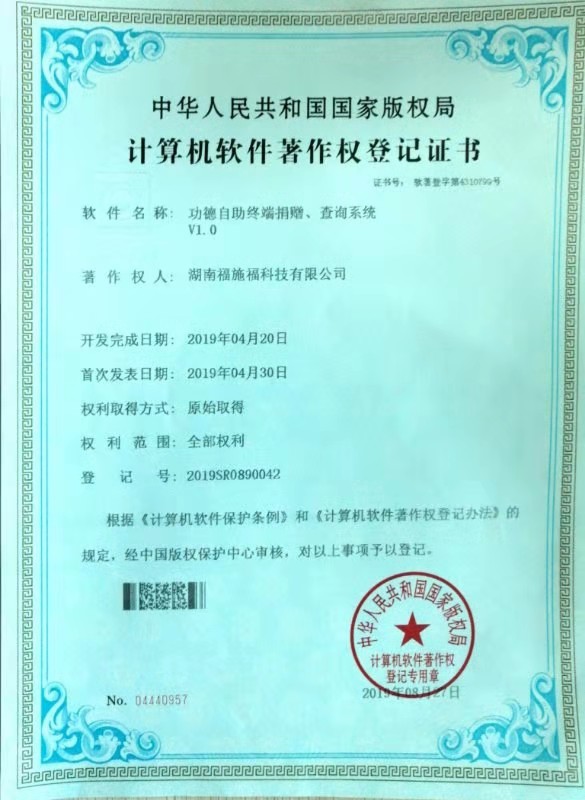 福施福功德自助终端捐赠、查询系统V1.0著作权登记证书-湖南福施福科技有限公司